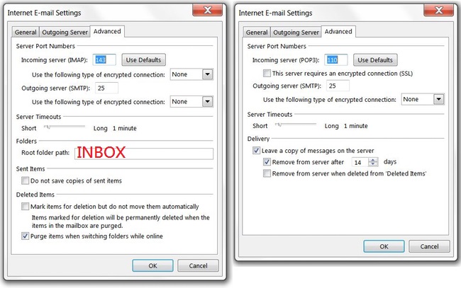 Please refer to the image on the left for IMAP servers; the image on the right-hand-side is for POP3 (not recommended). The following settings are correct: