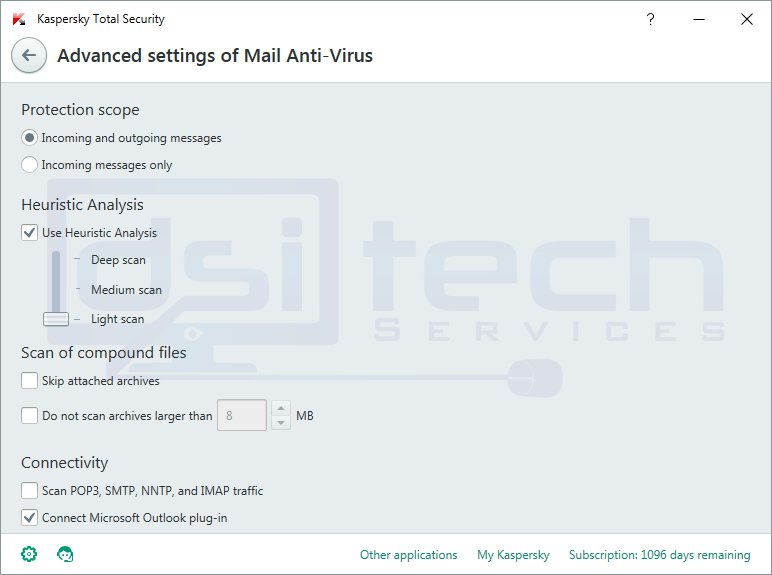 There is a setting change recommended when using Outlook with IMAP. This is to disable port scanning; apparently, scanning traffic as it travels through the ports causes an IMAP synchronization issue. Email scans are still performed. We recommend disabling “Anti-Spam” and also in Email Advanced Settings, to uncheck “Scan POP3, SMTP, NNTP, and IMAP traffic”.